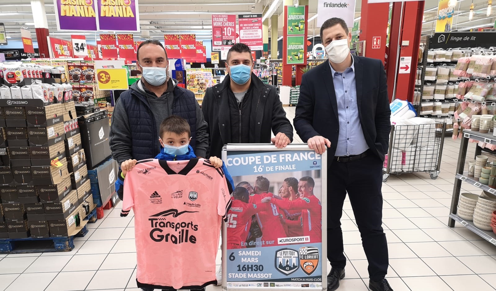Ce Ponot, qui joue en club à Loudes en Régional 3, fervent supporter du Puy Foot 43 Auvergne, a remporté le concours de pronostic organisé par Géant Vals-près-Le-Puy en marge du 32e de finale de coupe de France face à Chamalières ! La remise du maillot officiel – il a choisi la couleur … rose ! – a été effectuée par l’entraîneur de l’équipe de National 2, Roland Vieira, à Géant Vals, en présence du nouveau directeur de l’établissement, Jémérie Marini, lui aussi (nouveau) supporter et surtout partenaire du Puy Foot ! Bravo encore au lauréat !