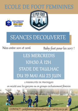 Le club propose des séances découverte tous les mercredis de 10h30 à 12h à partir du 19 mai jusqu’au 23 juin au stade de Taulhac. Ces séances sont accessibles pour les filles nées entre 2011 et 2016 et pour les 2017 avec le baby-foot.