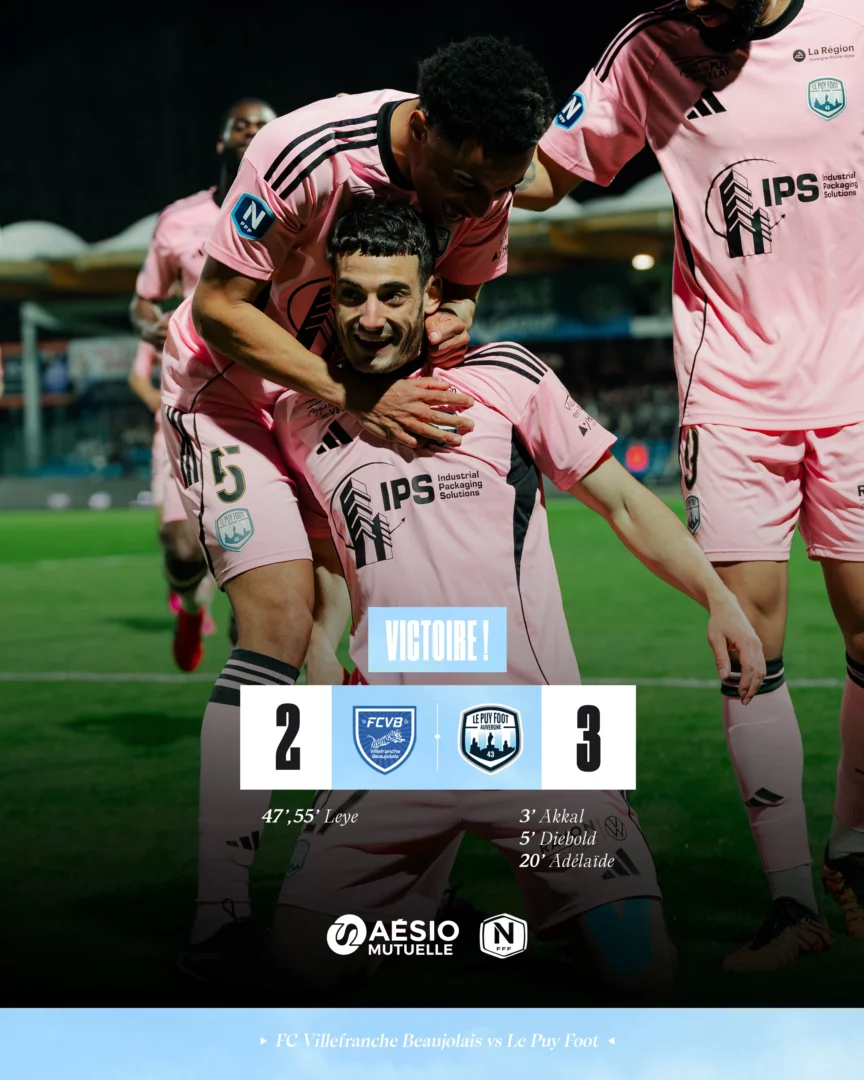 Au terme d’un match renversant, Le Puy Foot s’est imposé sur la pelouse du FC Villefranche Beaujolais (3-2). Ultra efficaces en première période, nos Ponots ont ensuite souffert face au réveil des locaux.