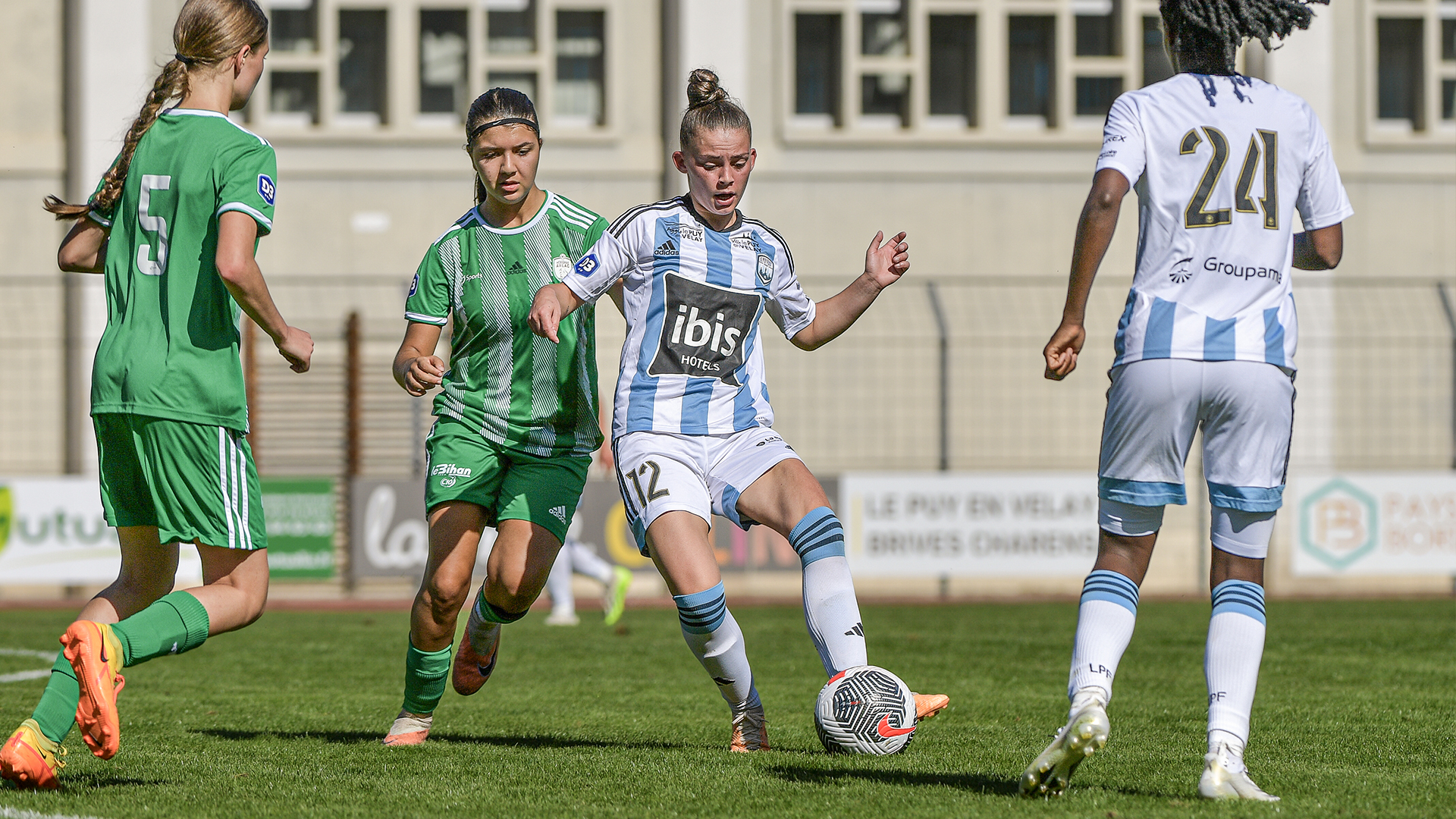 Nos Ponotes sont une très bonne série. Après s’être imposées à Valence la semaine dernière, les voilà victorieuses pour la première fois de la saison au Stade Massot. Il n’a pas fallut beaucoup de temps aux filles de Pierre-Yves Thomas pour prendre le dessus sur leur adversaire du week-end. Lors du premier quart d’heure, les filles se créent déjà deux grosses situations et en s’en récompensées qu’à la 20ème minute de jeu lorsque Marion Romanelli centre sur son côté gauche pour Zaharouna Haoudaji qui coupe parfaitement la trajectoire du ballon pour ouvrir le score. À la demi heure de jeu, Méline Gondol creuse l’écart en trompant la gardienne de Mérignac à bout portant après un enchainement de une-deux dans la surface de réparation. À la pause, le score est de 2-0 en faveur du Puy Foot. Dans ses buts, Cassandra Moinet n’est pas inquiétée et reste attentive sur les quelques opportunités des girondines.