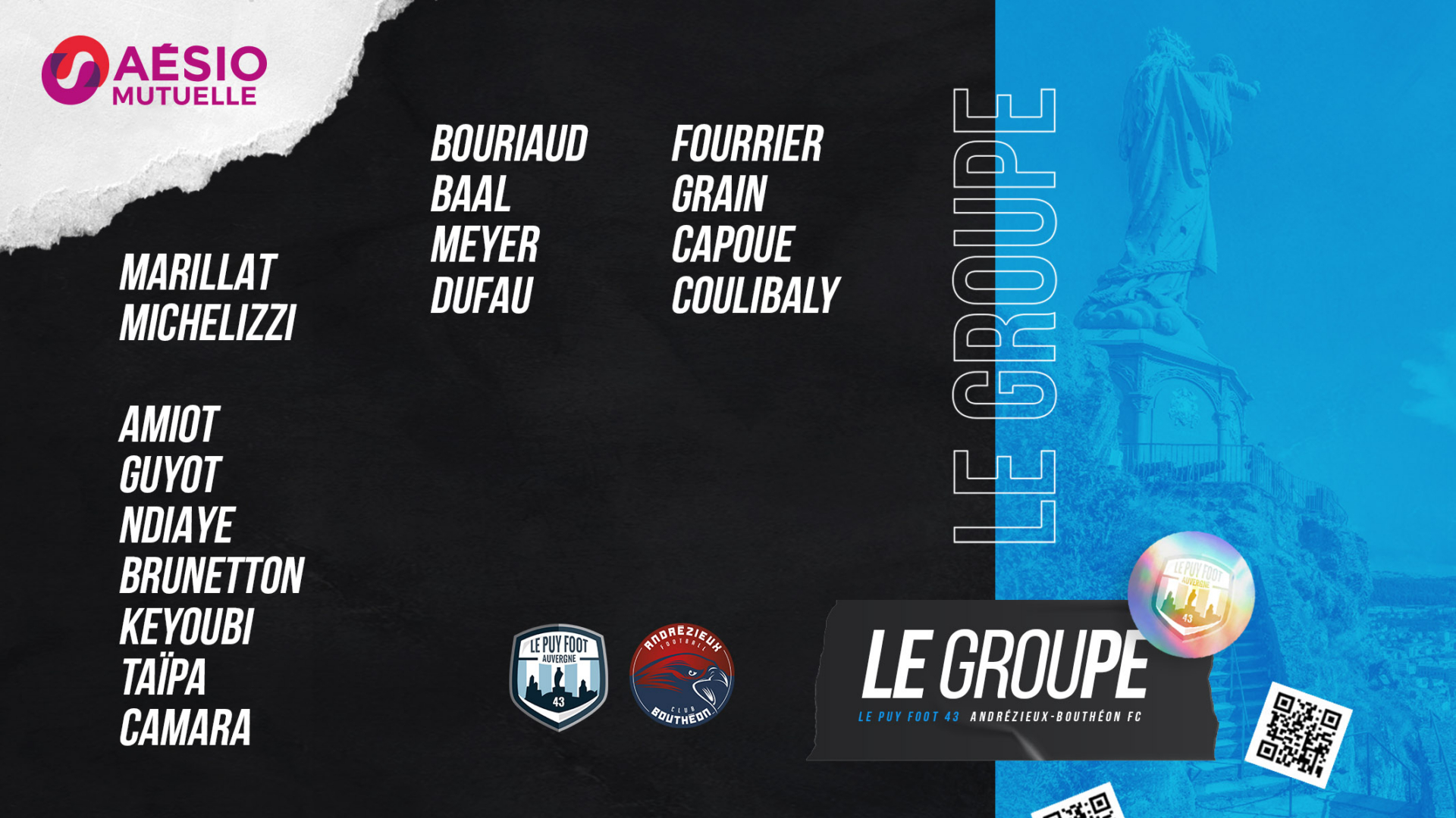 Le Puy Foot 43 reçoit Andrézieux-Bouthéon en rattrapage de la 15ème journée de National 2. Le match se tiendra ce samedi 29 janvier à 16h au Stade Massot. Ouverture du guichet à 15h. Découvrez le groupe sélectionné par le coach Roland Vieira à l’occasion de cette rencontre :