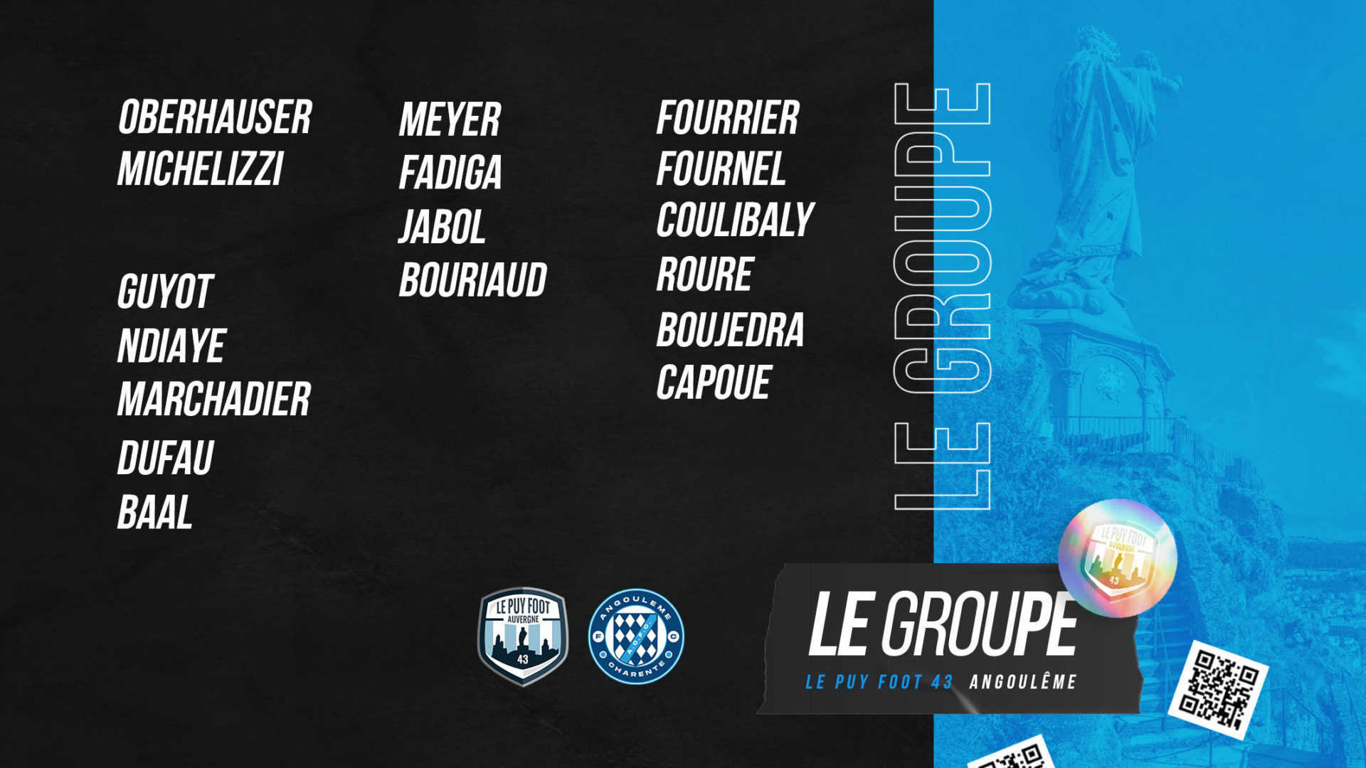 Le Puy Foot 43 reçoit Angoulême-Charente FC pour le compte de la 4ème journée de National 2. Le match se tiendra au stade Massot (le Puy-en-Velay) ce samedi 28 août à 18h. Ouverture aux spectateurs à 17h. Pass sanitaire et masque obligatoires pour accèder au stade. Découvrez le groupe élargi sélectionné par le coach Roland Vieira à l’occasion de cette rencontre :