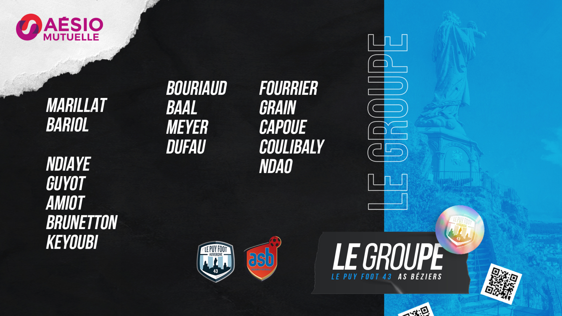 Le Puy Foot 43 reçoit l’AS Béziers ce samedi 12 mars (18h) au Stade Massot à l’occasion de la 21ème journée de National 2. Découvrez le groupe sélectionné par le coach Roland Vieira à l’occasion de cette rencontre :