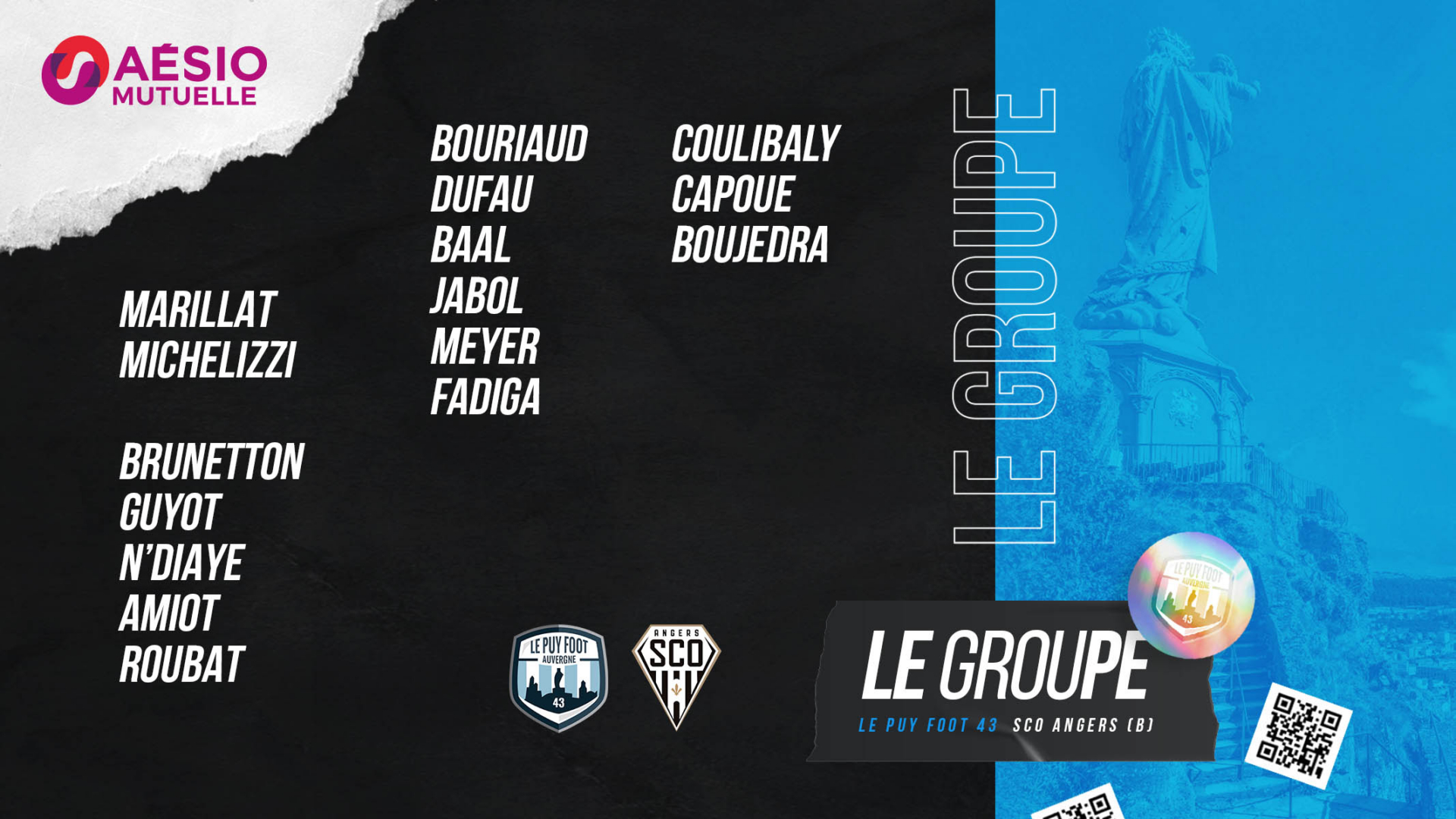 Le Puy Foot 43 reçoit Angers (B), pour le compte de la 11ème journée de National 2. Le match se tiendra ce samedi 6 novembre à 18h au Stade Massot du Puy-en-Velay. Découvrez le groupe sélectionné par le coach Roland Vieira à l’occasion de cette rencontre :