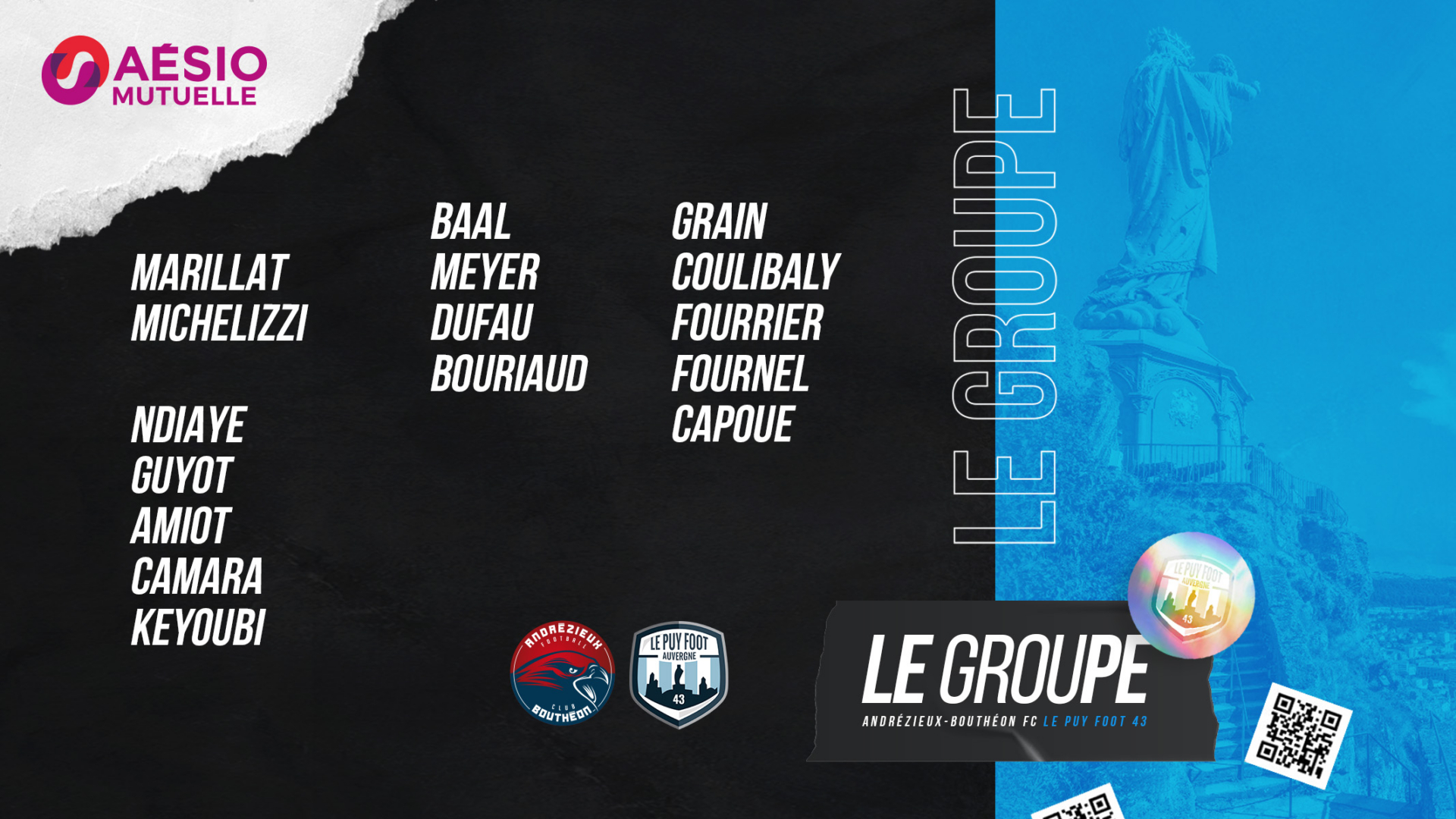 Le Puy Foot 43 se déplace à Andrézieux-Bouthéon ce samedi 21 mai (18h) à l’occasion de la 29ème journée de National 2. Découvrez le groupe sélectionné par le coach Roland Vieira à l’occasion de cette rencontre :