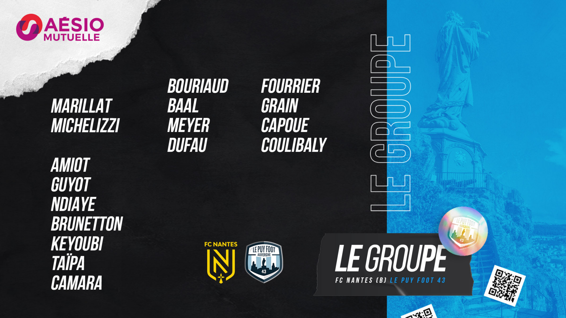 Le Puy Foot 43 se déplace à Nantes pour le compte de la 16ème journée de National 2. Le match se tiendra ce samedi 22 janvier à 18h. Découvrez le groupe sélectionné par le coach Roland Vieira à l’occasion de cette rencontre :
