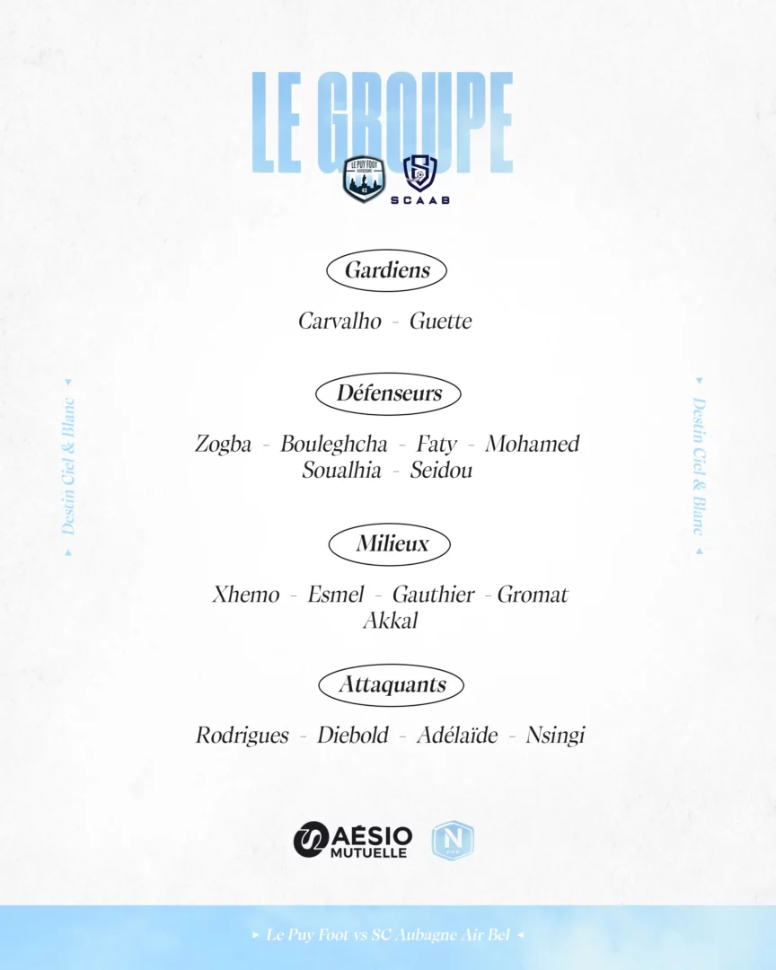 À l’occasion de la 29ème journée de National, Le Puy Foot reçoit Aubagne Air-Bel ce vendredi. Découvrez le groupe convoqué par le staff à l’occasion de cette rencontre.