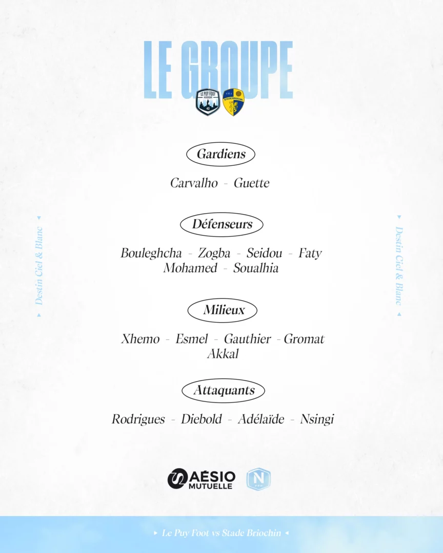 À l’occasion de la 23ème journée de National, Le Puy Foot reçoit le Stade Briochin ce vendredi. Découvrez le groupe convoqué par le staff à l’occasion de cette rencontre.