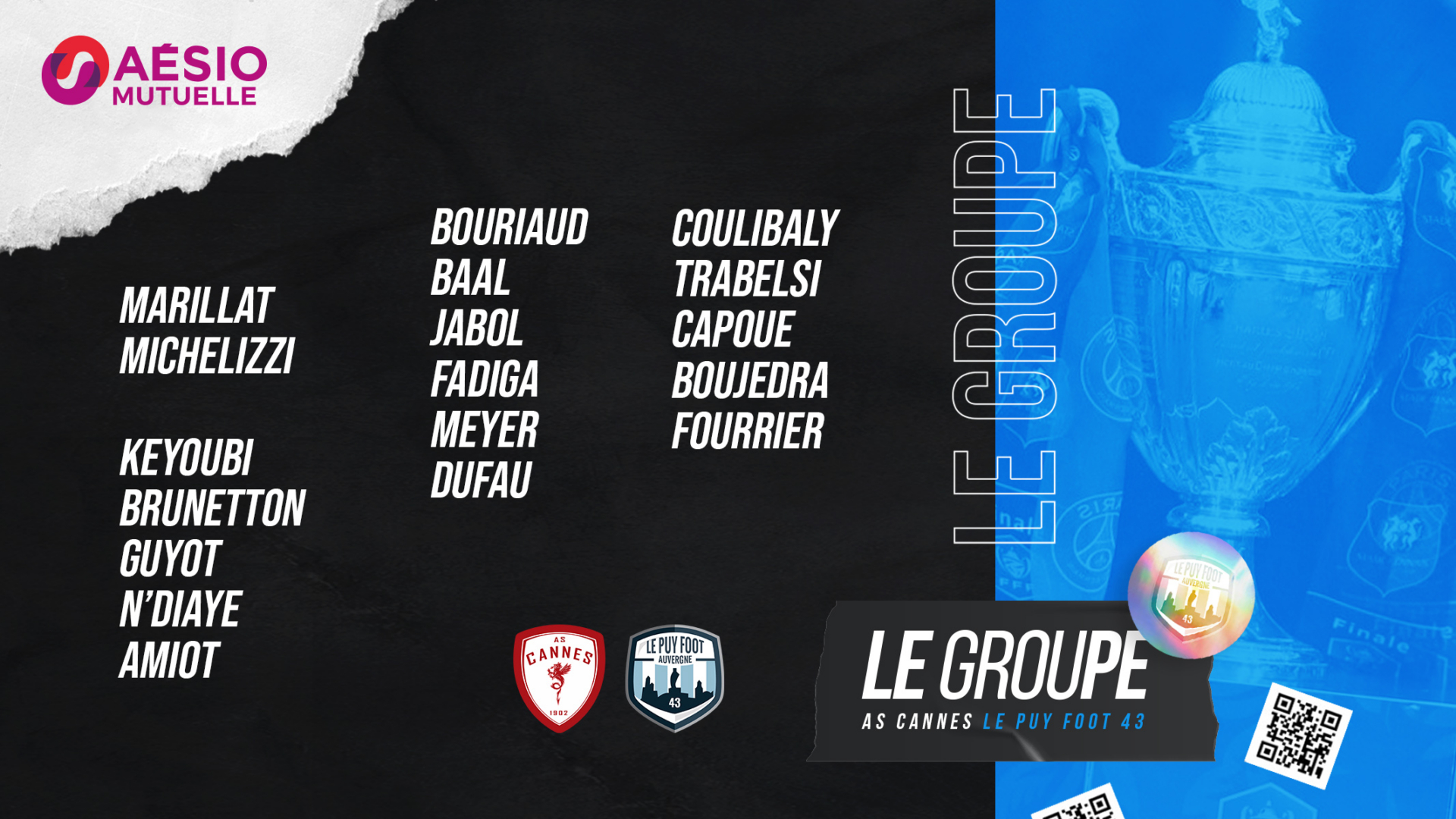Le Puy Foot 43 se déplace à Cannes pour le compte du 7ème tour de la Coupe de France. Le match se tiendra ce samedi 13 novembre à 18h. Découvrez le groupe sélectionné par le coach Roland Vieira à l’occasion de cette rencontre :