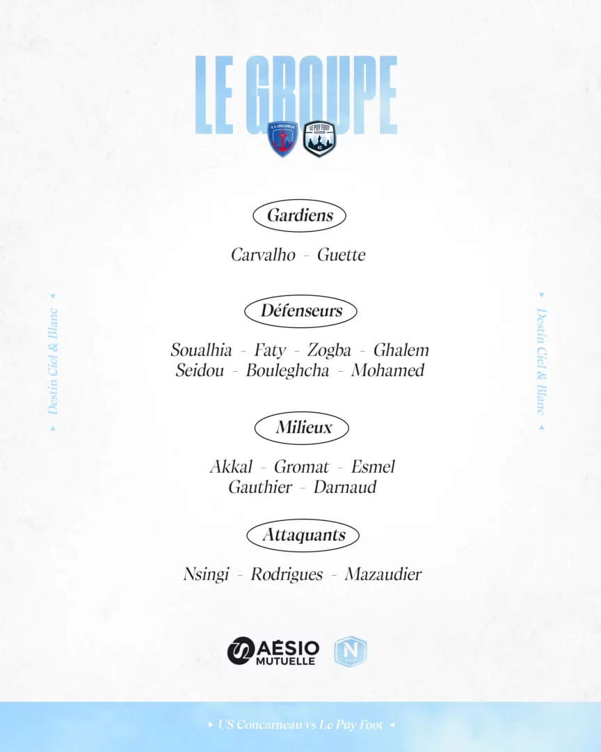 À l’occasion de la 28ème journée de National, Le Puy Foot se déplace à Concarneau ce vendredi. Découvrez le groupe convoqué par le staff.