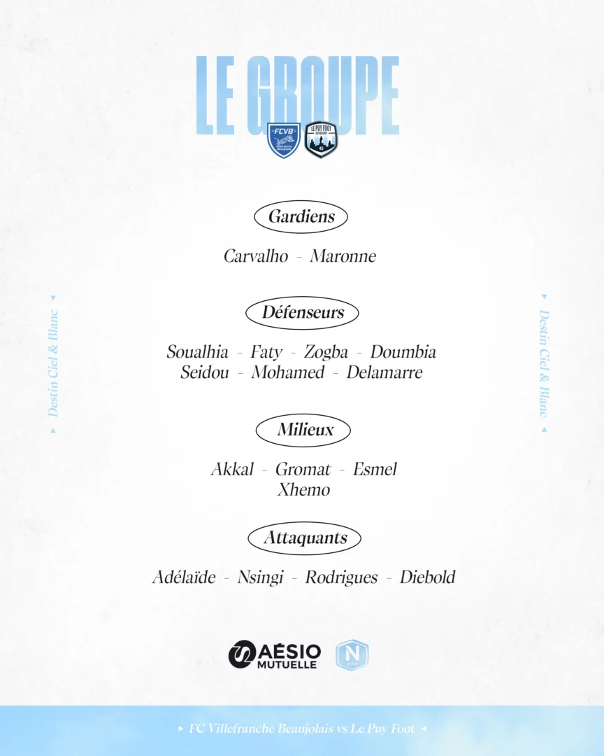 À l’occasion de la 26ème journée de National, Le Puy Foot se déplace sur le terrain du FC Villefranche-Beaujolais ce vendredi. Découvrez le groupe convoqué par le staff.