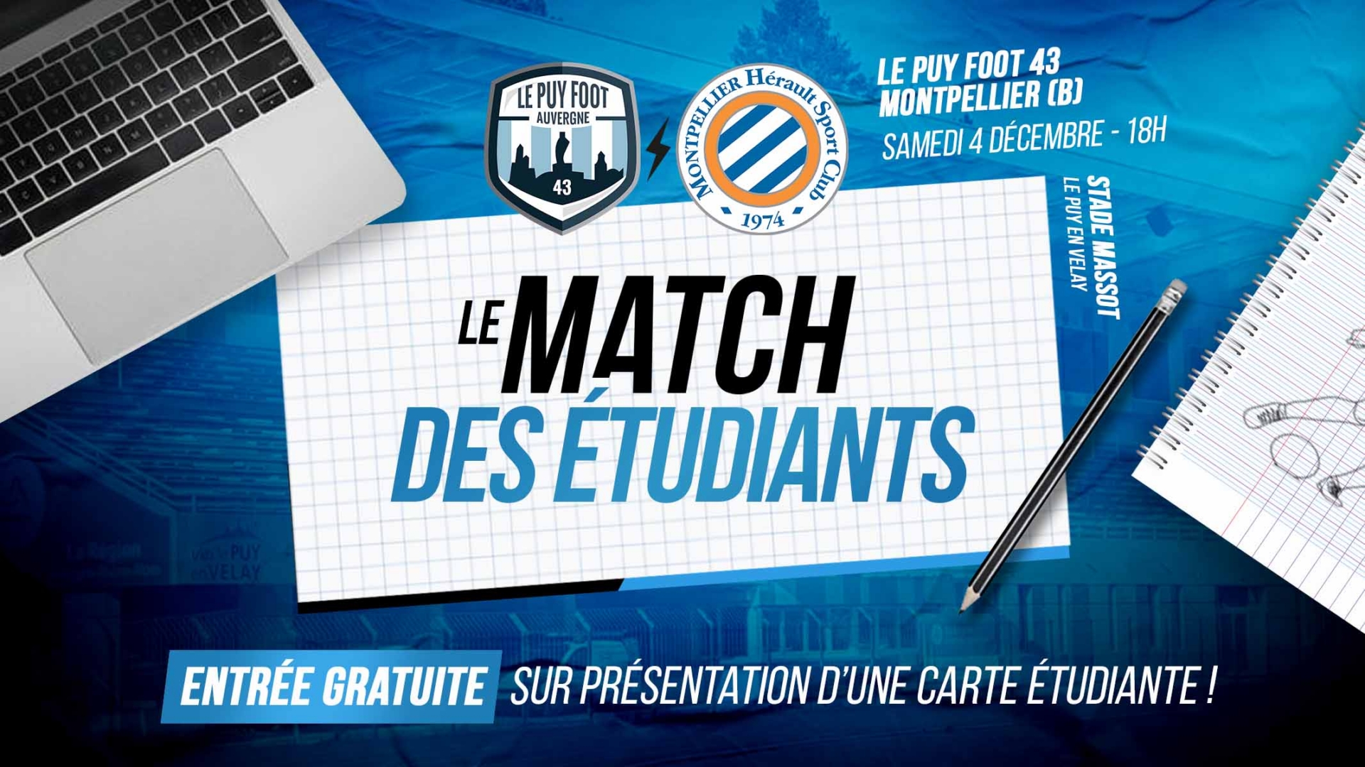 Le Puy Foot 43 soutient les étudiants du Puy-en-Velay et du département ! À l’occasion de la 13ème journée de National 2 face à l’équipe réserve du club professionnel de Montpellier, les étudiants pourront accéder gratuitement à la tribune du Stade Massot.