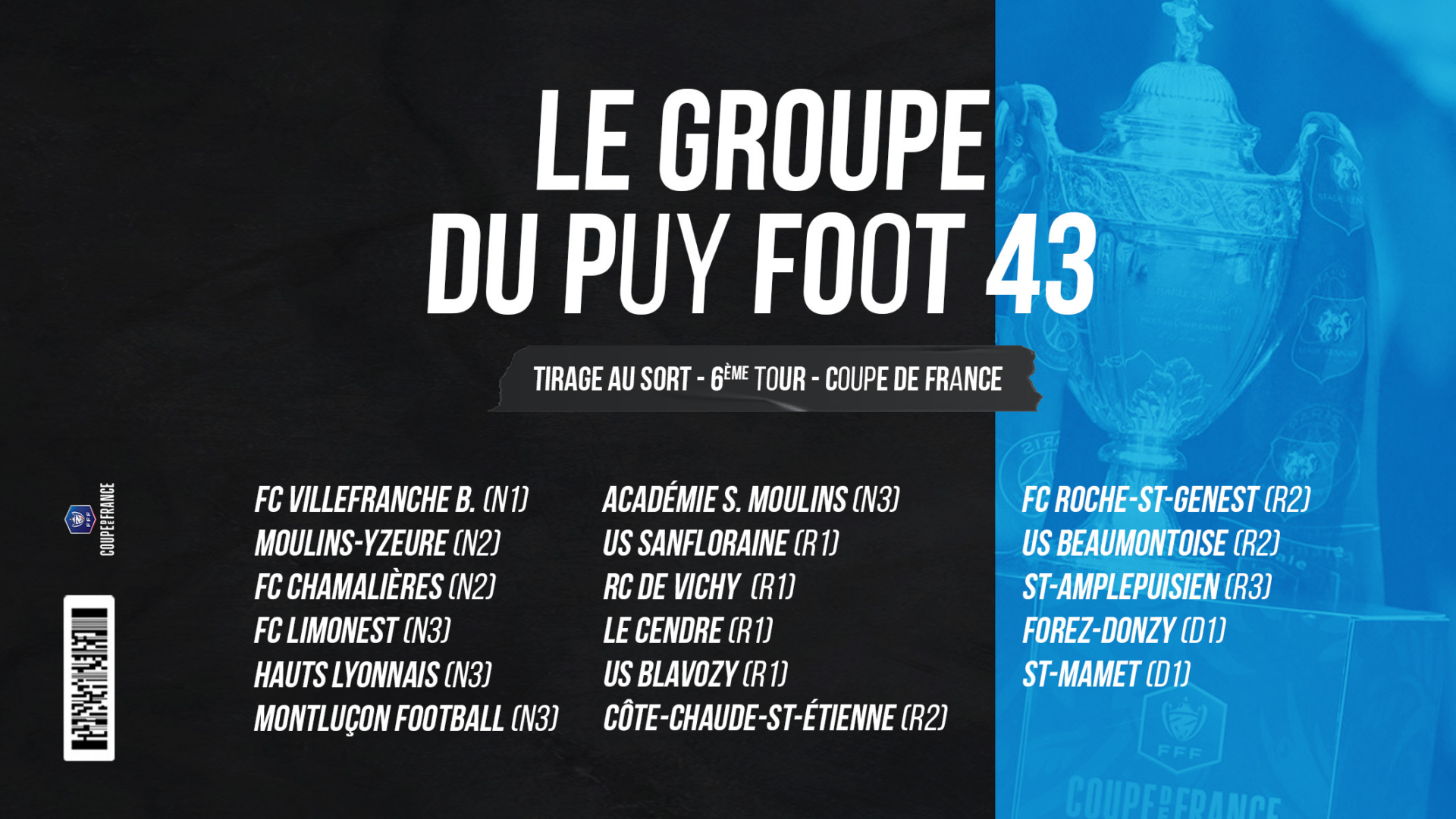 Le Puy Foot 43 est qualifié pour le 6ème tour de Coupe de France. Découvrez les 18 adversaires potentiels des Ciel & Blanc avant le tirage au sort demain, 15h30, sur France 3. Les matchs se tiendront le week-end du 30 et 31 octobre prochain.