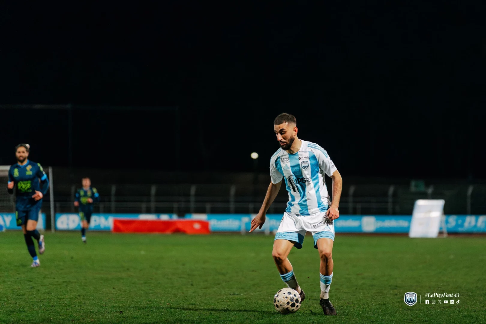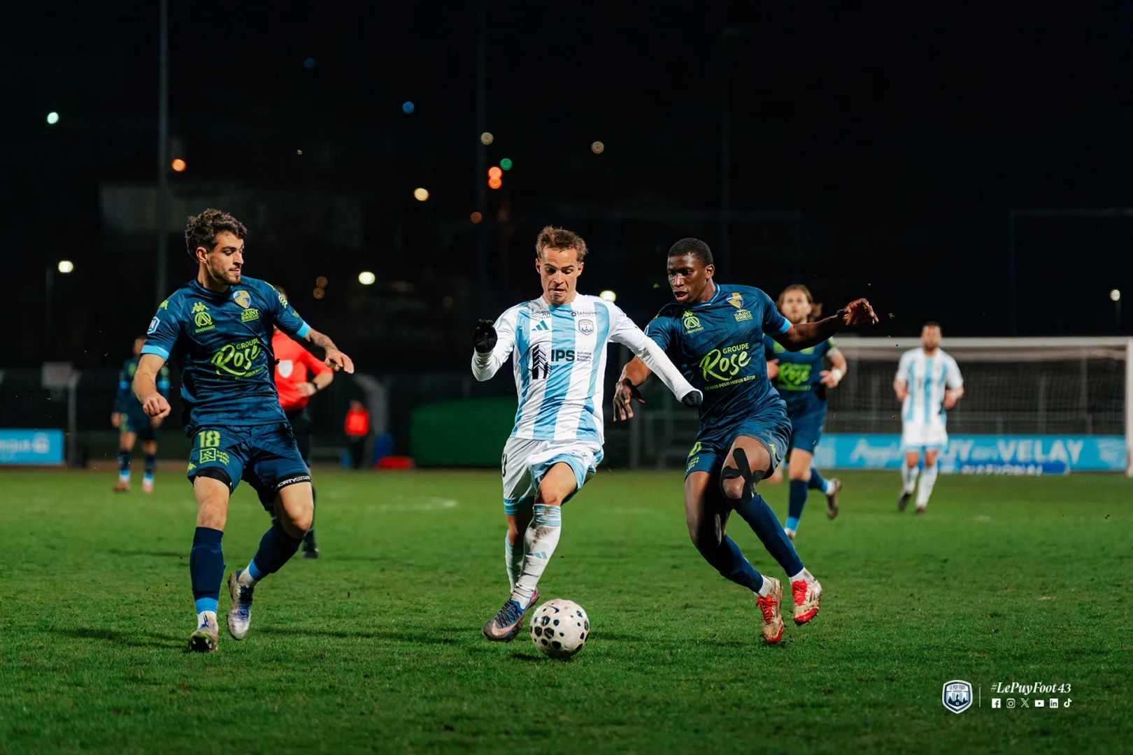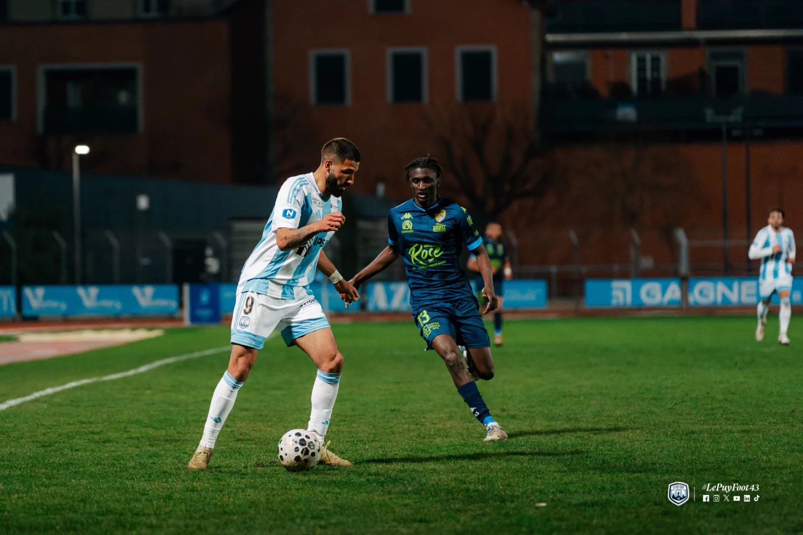 Le début de la rencontre était rythmé, avec des occasions de part et d’autre. Le fait marquant de cette première période intervenait toutefois à la 23e minute. Sur une offensive ponote, Edson Seidou et Aimeric Gomis se percutaient violemment lors d’un choc frontal et restaient tous deux au sol. Si le défenseur vellave parvenait à se relever, l’attaquant briochin demeurait étendu de longues minutes, nécessitant l’intervention des sapeurs-pompiers. Après 23 minutes d’interruption, le joueur de Saint-Brieuc était évacué sous les applaudissements du public.