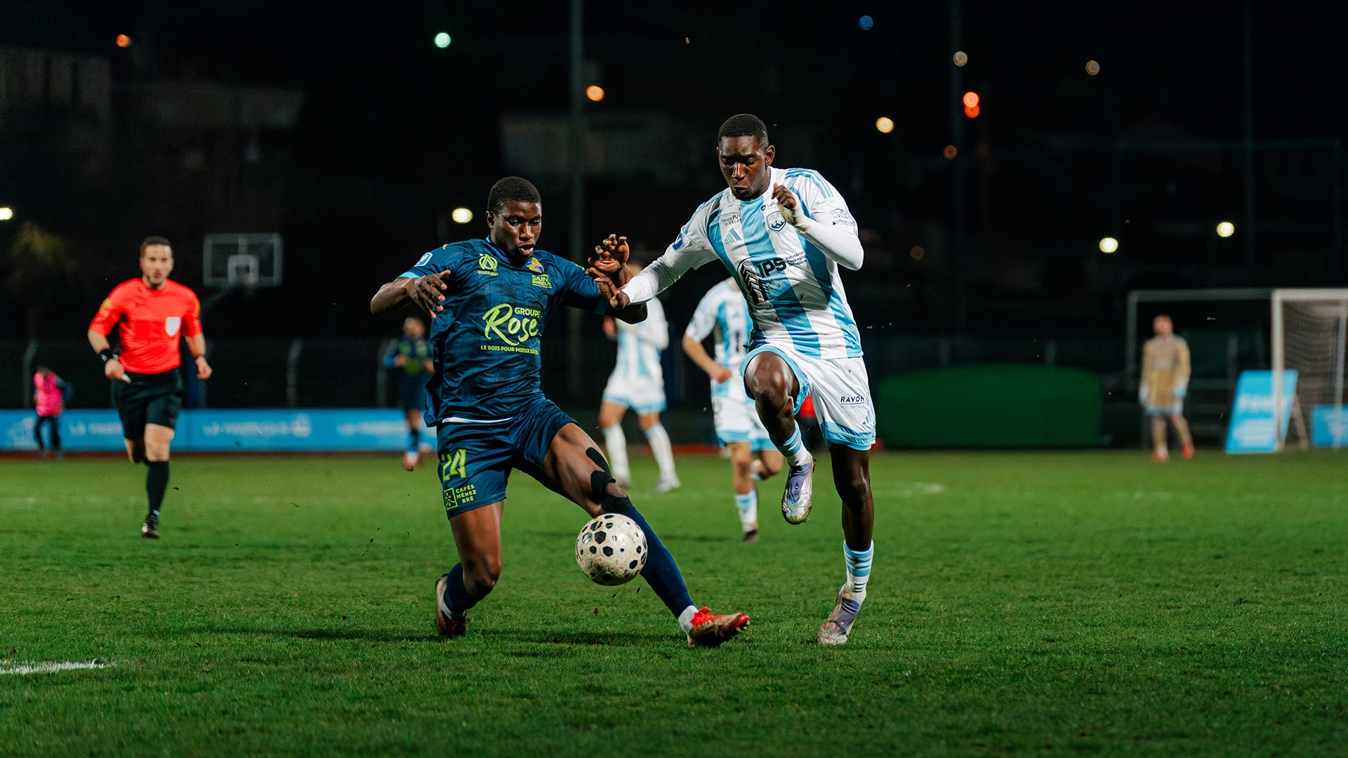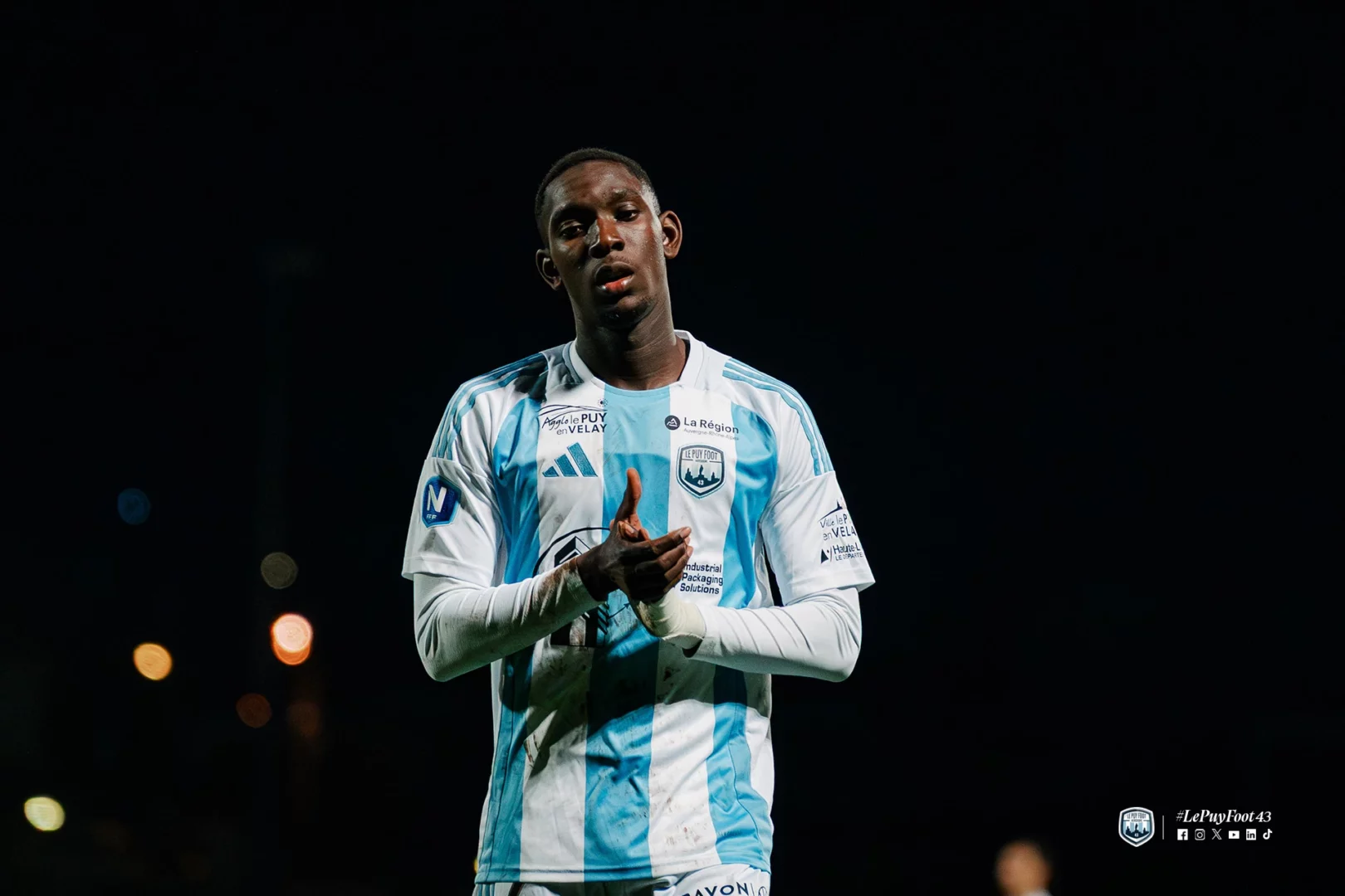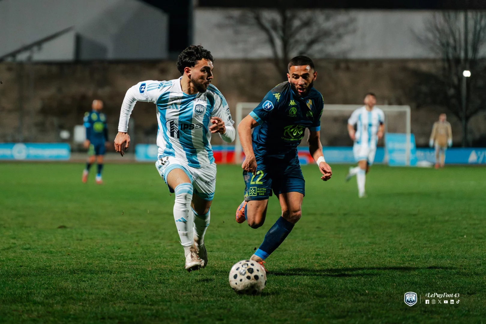 Le début de la rencontre était rythmé, avec des occasions de part et d’autre. Le fait marquant de cette première période intervenait toutefois à la 23e minute. Sur une offensive ponote, Edson Seidou et Aimeric Gomis se percutaient violemment lors d’un choc frontal et restaient tous deux au sol. Si le défenseur vellave parvenait à se relever, l’attaquant briochin demeurait étendu de longues minutes, nécessitant l’intervention des sapeurs-pompiers. Après 23 minutes d’interruption, le joueur de Saint-Brieuc était évacué sous les applaudissements du public.