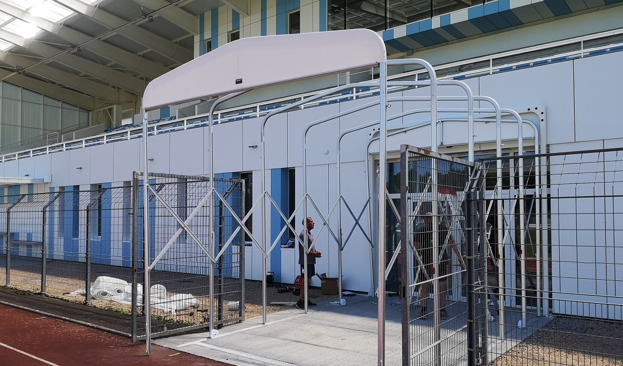 Les rails et la structure du nouveau tunnel du stade Massot ont été posés hier. Il devrait être terminé aujourd’hui, avec la pose de la bâche.