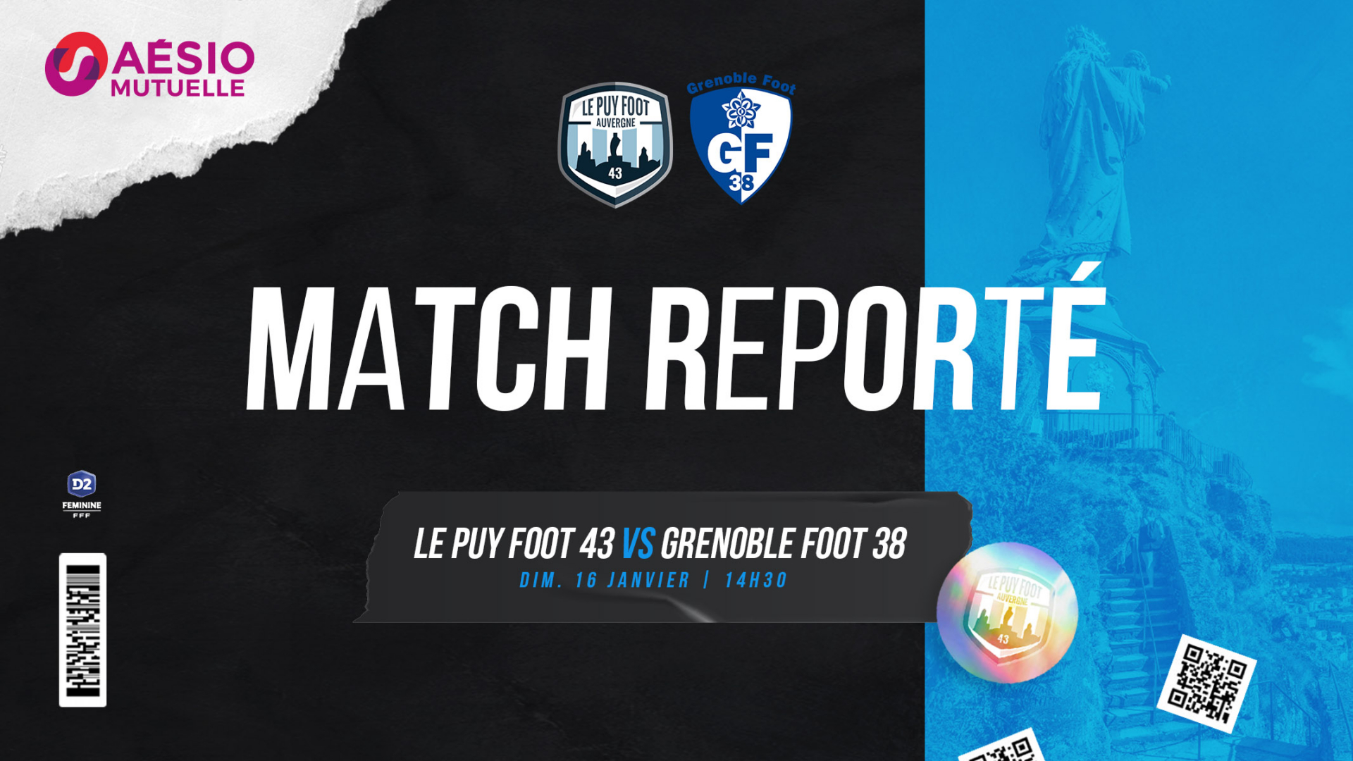 En raison d’un arrêt municipal sur les installations sportives du Puy-en-Velay, la rencontre de D2 féminine initialement prévue ce dimanche 16 janvier à 14h30, est reportée.