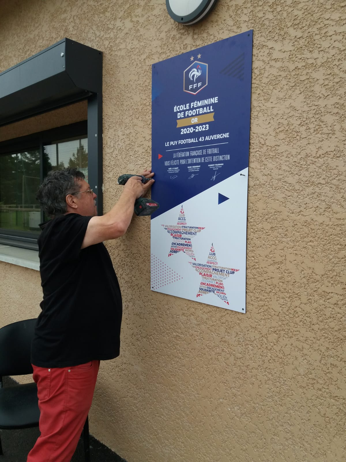 Ce jeudi matin au stade de Taulhac, le label école féminine de football niveau or a été installé. Un grand merci à « Zizou » qui a œuvré pour la mise en place des plaques mais également pour l’aménagement du local à matériel.