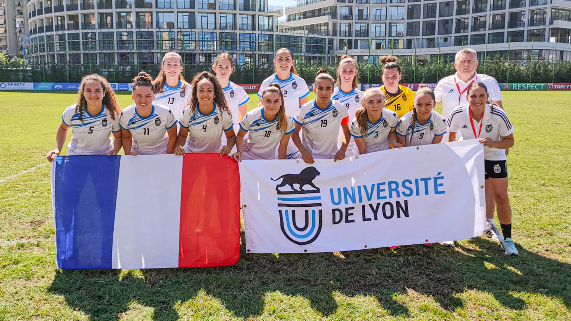Axelle Vincent (numéro 12 sur la photo), Charlotte Ouillon (11) et Louisa Djemaï (19) sont toutes les trois licenciées du Puy Foot 43 et joueuses de l’équipe fanion féminine. Actuellement à Tirana en Albanie, elles défendent cet été l’étendard de l’Université de Lyon à l’occasion des championnats d’Europe Universitaires.
